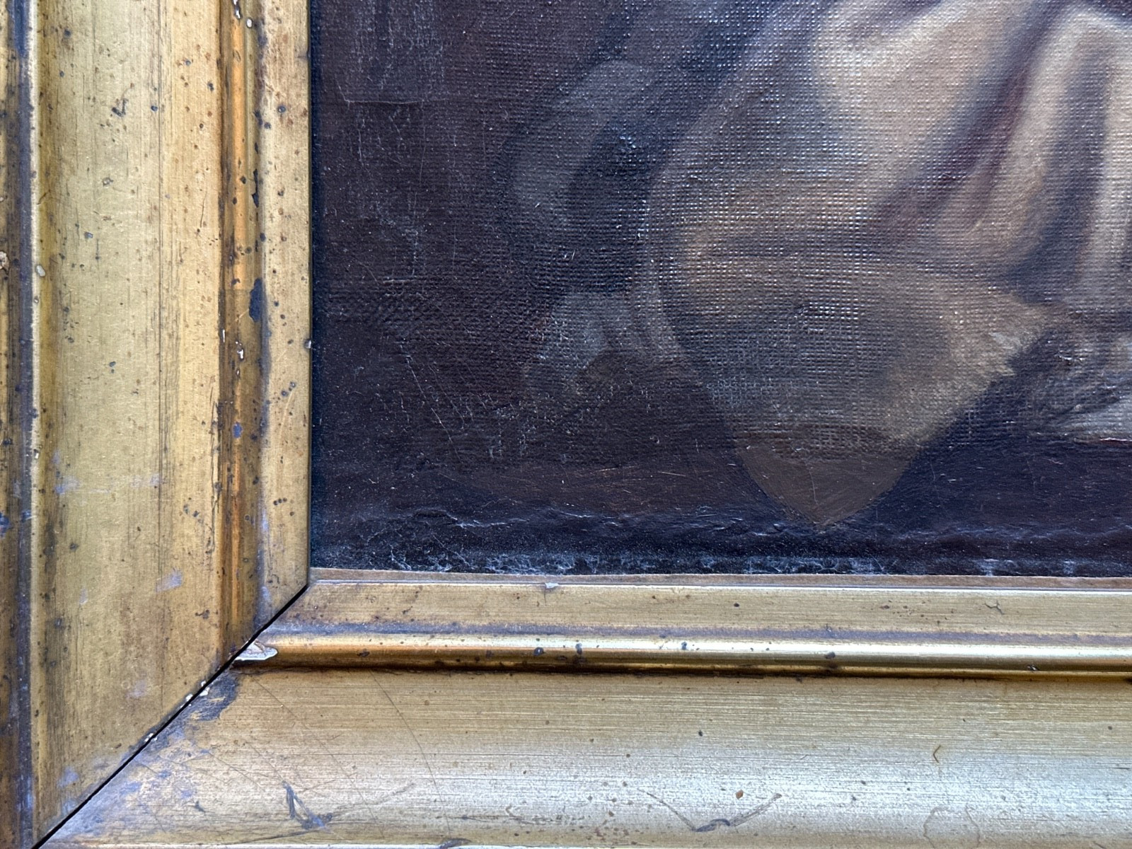 - Frame & condition: Golden period frame with molding; old patina, oxidized varnish, and restorations; ready to hang